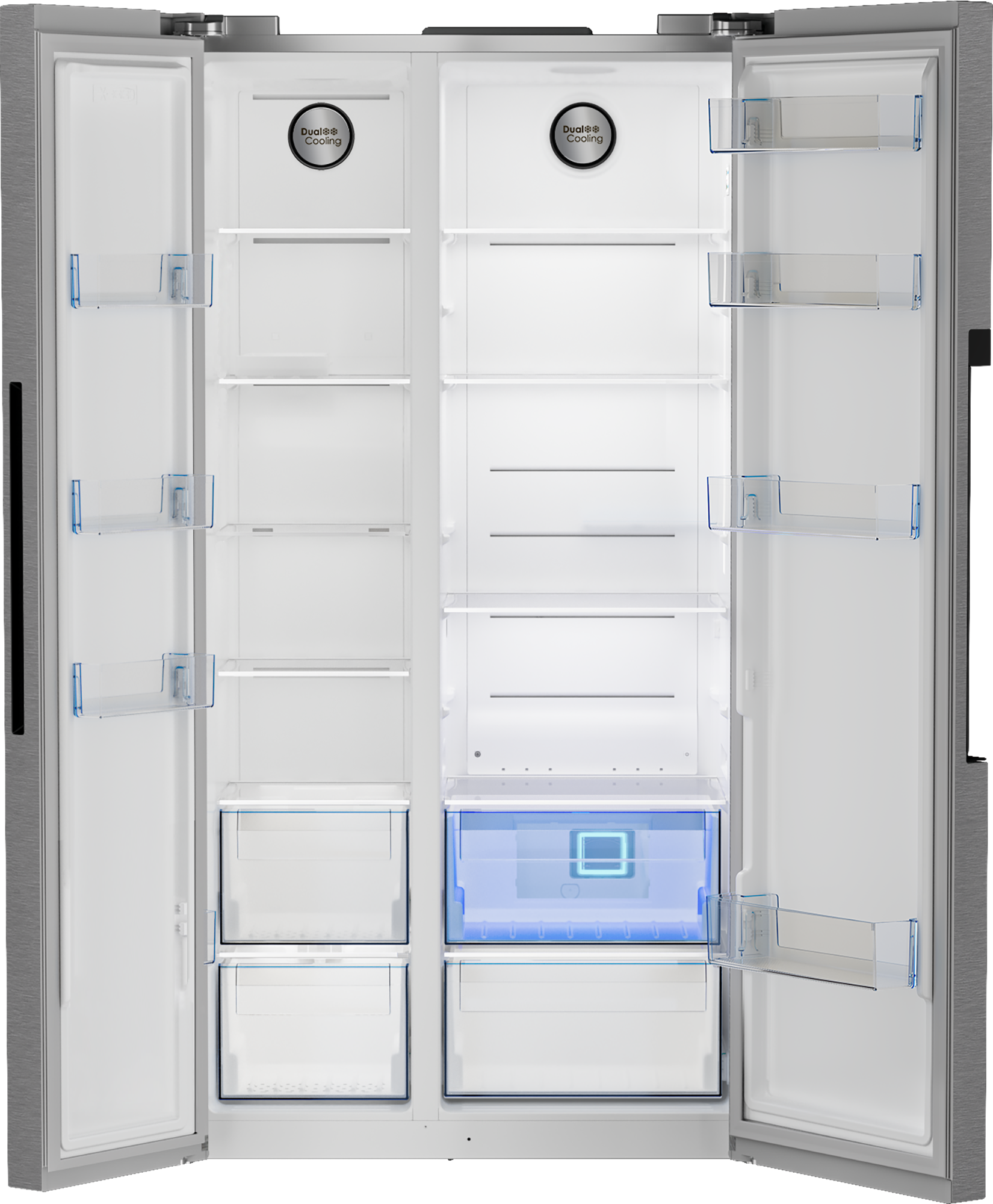 The Defy 559L Side-by-Side Fridge DFF536 combines advanced dual cooling technology with a no frost system to keep your food fresher for longer. Its energy-efficient A rating ensures you save on electricity while enjoying reliable performance. Designed with an integrated handle for a streamlined look and LED illumination for clear visibility, this fridge offers both style and convenience for any kitchen.